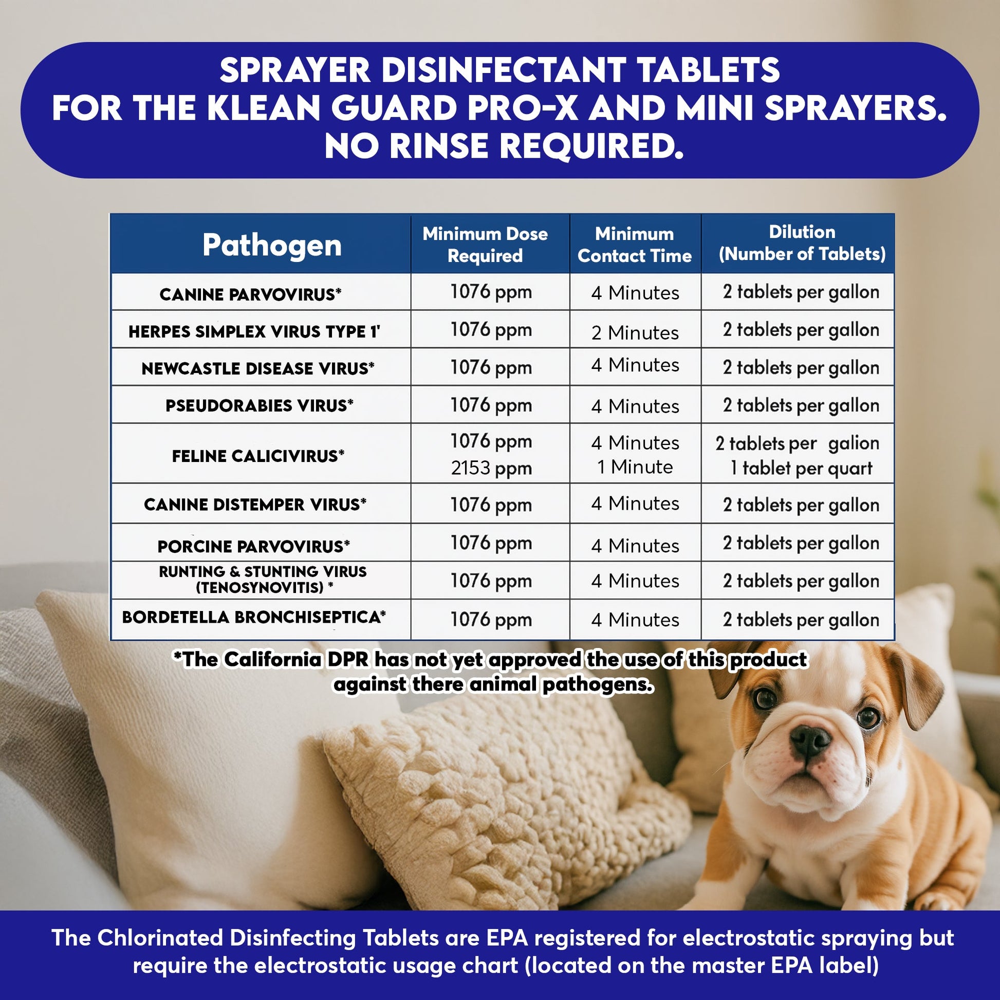 Add one tablet to the Klean Guard sprayer unit to be effective against a broad range of critical animal pathogens.