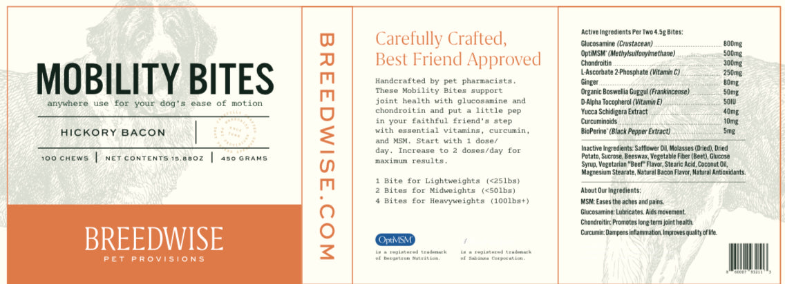 Our Mobility Bites are specially designed to ease the aches and pains that come with growing older. As the second addition to our product portfolio, our Mobility Bites are a way for us to continue our mission of helping all dogs, especially as they continue into their golden years.