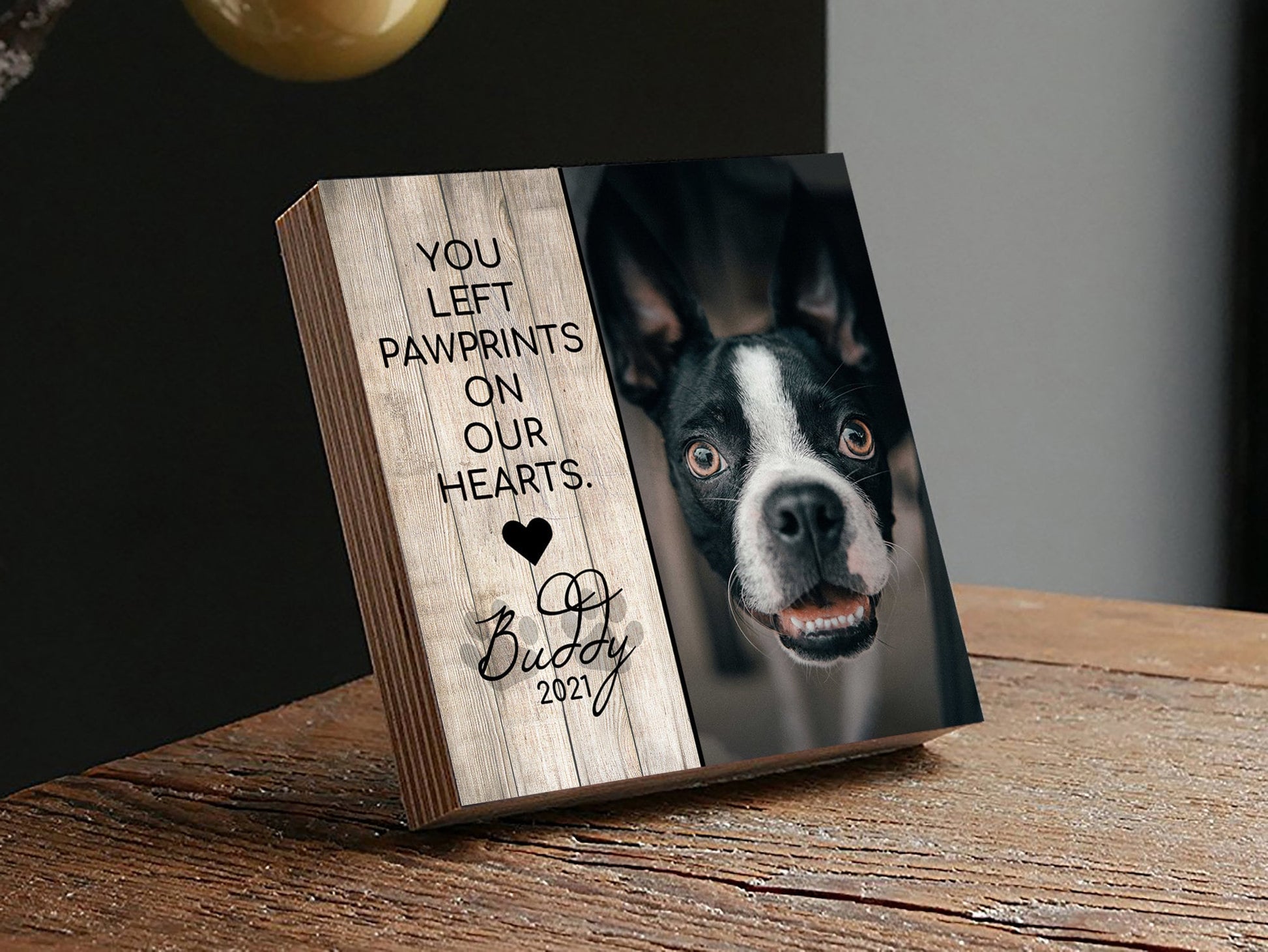 Personalized Pet Memorial Gift 4" or 6" - Printed Wood Photo Block - You Left Paw Prints On Our Heart - Dog Memorial Frame