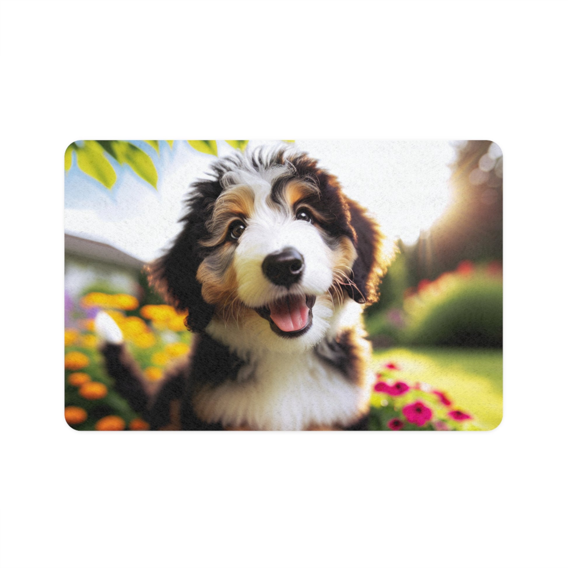 This Pet Food Mat 12x18 featuring a beautiful Bernedoodle design is perfect for pet owners looking to add a touch of style to their pet's feeding area. The strong polyester front and neoprene rubber backing ensure durability and slip resistance. Vibrant colors make this mat stand out and add personality to your space. Perfect for pet owners celebrating their love for their furry friends.