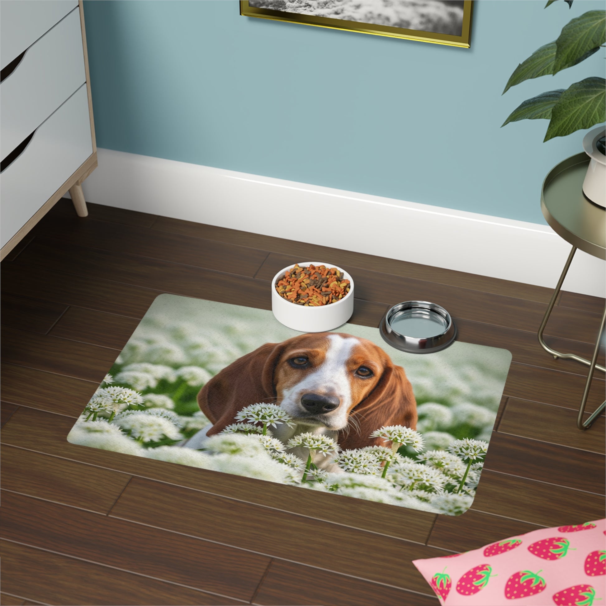 This Pet Food Mat 12x18 featuring a beautiful Petit Basset Griffon Vendeen design is perfect for pet owners looking to add a touch of style to their pet's feeding area. The strong polyester front and neoprene rubber backing ensure durability and slip resistance. Vibrant colors make this mat stand out and add personality to your space. Perfect for pet owners celebrating their love for their furry friends.