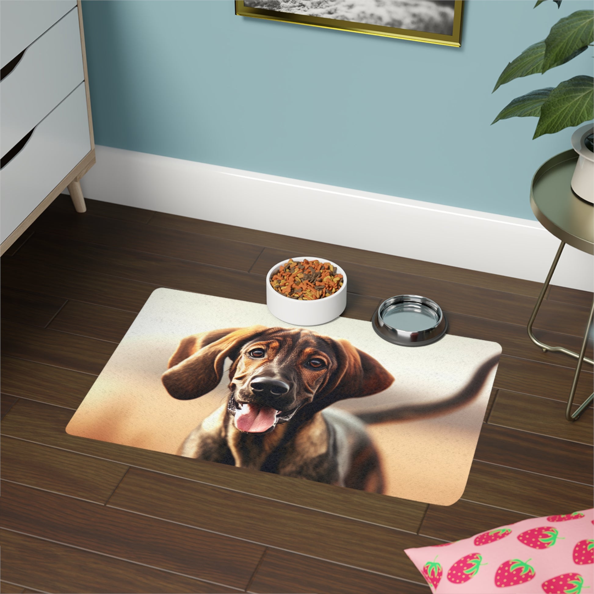 This Pet Food Mat 12x18 featuring a beautiful Plott Hound design is perfect for pet owners looking to add a touch of style to their pet's feeding area. The strong polyester front and neoprene rubber backing ensure durability and slip resistance. Vibrant colors make this mat stand out and add personality to your space. Perfect for pet owners celebrating their love for their furry friends.